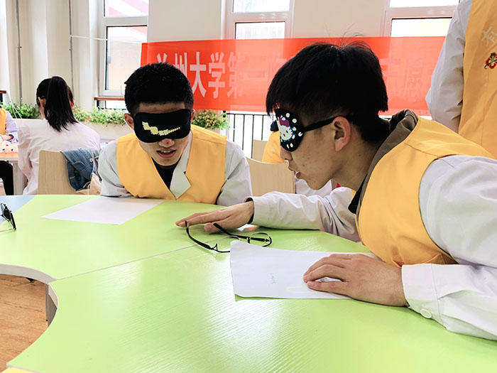 心理体验式培训:为让志愿者们感同身受的体会视障人士的世界,教务处负责人郭鹏军对志愿者进行了体验式培训,带着眼罩的志愿者们短暂感受黑暗,感受视障人士行动不易,感受视障人士的内心世界,通过体验式培训让志愿者更能走进患者心里,增强换位意识,为今后走向工作岗位打下基础。